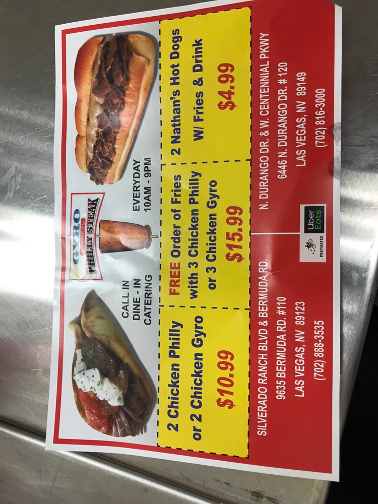 Introducing Gyro Express Philly Steaks, located at 9635 Bermuda Rd Ste 110 in Las Vegas, offering a diverse menu with Angus Burgers, Philly Cheesesteaks, Gyros, Kabobs, Salads, and more. Customers rave about the fresh and flavorful food, with standout dishes like the Philly Cheese Steak Gyro and the Halal Menu. The restaurant provides delivery, takeout, and catering options, making it convenient for all occasions. With a friendly staff and clean facilities, Gyro Express provides a welcoming atmosphere for enjoying classic favorites like the Chicken Philly and appetizing sides like fries and quesadillas. Don't miss out on the authentic flavors and excellent service that Gyro Express Philly Steaks has to offer.
